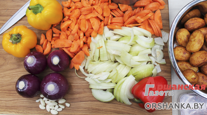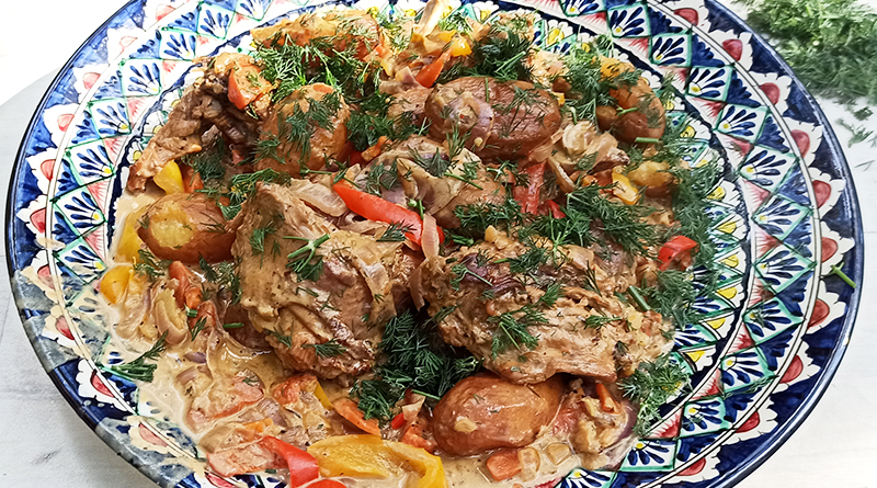 Нам понадобится: тушка молодого кролика (примерно 1,7-2 кг), 800 мл сметаны (25-26 % жирности), 700-800 мл воды, 20 клубней картофеля среднего размера, 4-5 луковиц репчатого лука, 4-5 луковиц красного сладкого лука, 2-3 шт. болгарского перца, 3-4 моркови среднего размера, 250 мл растительного масла, соль, специи, зелень по вкусу (укроп, петрушка, кинза, базилик).