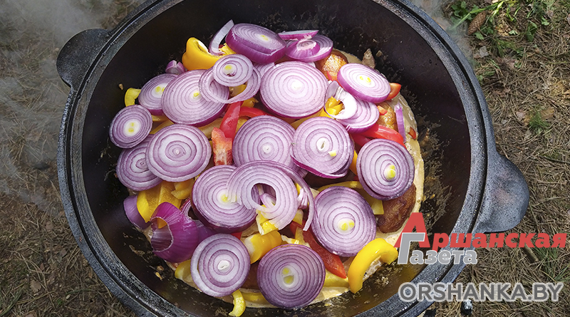 Получившуюся прожаренную массу из мяса, лука и моркови заливаем сметаной, перемешиваем. Делаем в печке минимальный огонь. Накрываем крышкой казан и тушим мясо, лук, морковь в сметане около 30 минут. Затем выкладываем слоями сначала обжаренный картофель, потом сладкий болгарский перец и сверху накрываем кольцами красного лука. Аккуратно наливаем воду 0,5-0,8 литра так, чтобы лук не был покрыт водой. Сверху немного солим и добавляем приправу хмели-сунели.