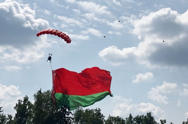Затем началось авиашоу Минского аэроклуба имени Сергея Грицевца с участием парашютистов. На стадион городского поселка, где собрался практически весь коллектив предприятия, парашютисты приземлились с государственным флагом. Пилот Леонид Курсов на вертолете МИ-2 выполнил несколько проходов над стадионом на малой высоте, показал сложные фигуры пилотажа, в том числе знаменитую «змейку».
