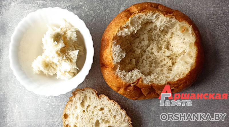 Подготавливаем хлеб. Срезаем верхушку, это будет наша крышечка. Аккуратно вынимаем мякоть, не повреждая целостность хлеба, чтобы остались плотные стенки. Ставим в духовку, разогретую до 240 градусов, на 10 минут (ориентируйтесь на свою духовку), чтобы хлеб зарумянился и схватился снаружи и изнутри. Достаем из духовки. Аккуратно наливаем горячий суп в «хлебную тарелку», посыпаем зеленью, накрываем хлебной крышечкой и подаем к столу горячим.