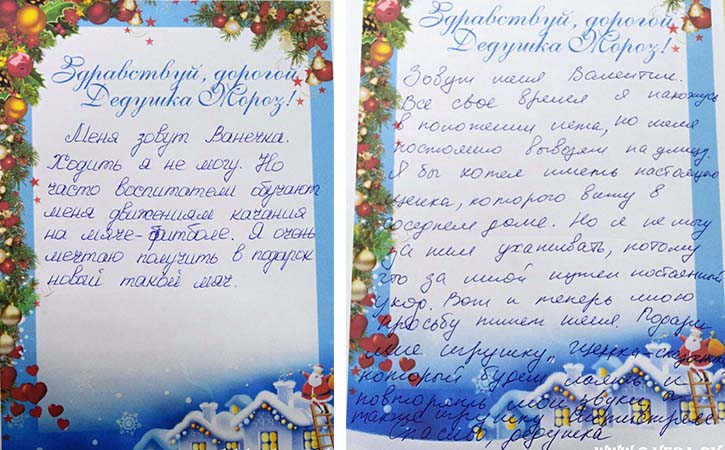 Среди ребят, которые отправляли письма, есть и тяжелобольные дети, которые находятся в отделениях паллиативного ухода, имеют тяжелые нарушения умственного и физического развития. За таких ребят письма писали воспитатели, которые просили подарки исходя из особенных потребностей детей. Это удобная пижама, развивающая игрушка, ортопедический коврик, предметы для реабилитационных занятий.