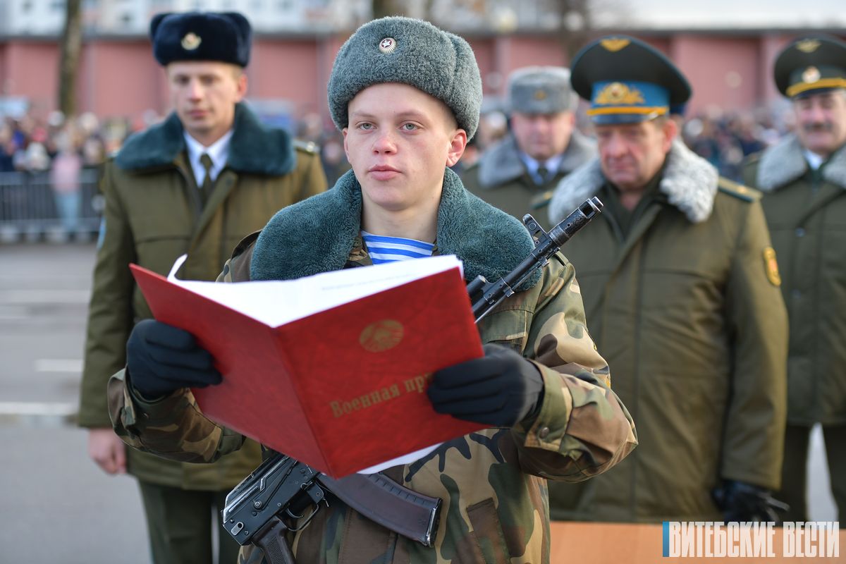 В соединениях и воинских частях Вооруженных Сил по всей Беларуси прошли праздничные мероприятия, посвященные принесению присяги новобранцами. В этот день не одна тысяча молодых людей, в том числе из Витебщины, в торжественной обстановке принесли клятву на верность белорусскому народу. Традиционно подобные церемонии проходят в присутствии представителей Министерства обороны, местных властей, общественных организаций, ветеранов, родственников и друзей. Так, поздравить очередное пополнение знаменитой 103-й Витебской отдельной гвардейской воздушно-десантной бригады приехали командующий силами специальных операций Вооруженных Сил генерал-майор Вадим Денисенко, заместитель председателя горисполкома Виктор Глушин, председатель областной организации Белорусский союз ветеранов войны в Афганистане Валерьян Мацкевич.