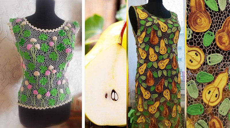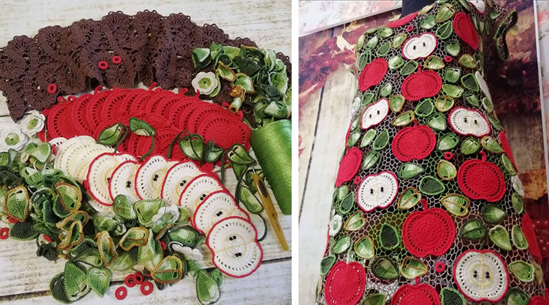 Суть данной техники в том, что полотно собирается из отдельно связанных мотивов, соединенных в единую композицию. Все цветочные элементы мастерица собирает в то или иное изделие при помощи выкройки и манекена. Так появилось платье «Яблочный Спас», а также шаль «Октябрина», кофточка «Рябинка», в которых Юлия передала все, что так любит наблюдать в осеннюю пору.
