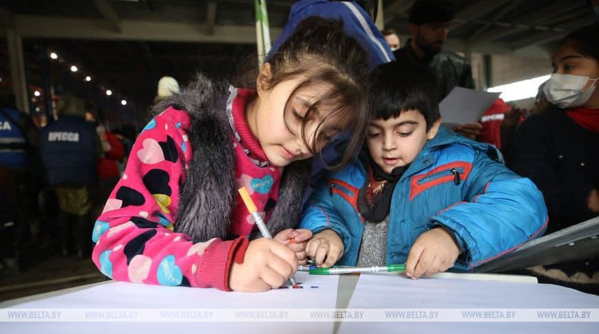 Фестиваль детских рисунков «Беларусь гостеприимная» проходит сегодня в пункте временного размещения беженцев, передает корреспондент БЕЛТА.