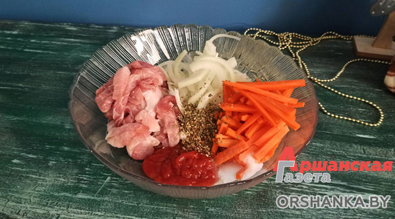 Для приготовления нам понадобится: 300 г свинины, 1 морковь, 1 луковица, 50 г кетчупа, 100 мл воды, соль и приправа по вкусу.