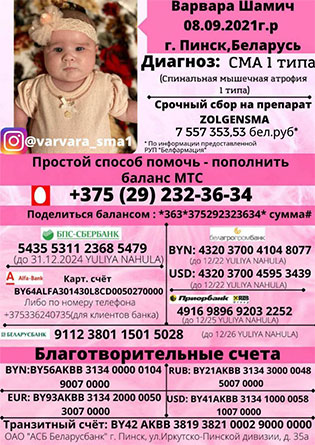 Начались поиски лекарств для спасения Варвары и такой препарат нашелся. Один укол лекарства Zolgensma может спасти дочь и восстановить двигательную активность. Он останавливает развитие заболевания и улучшает состояние ребенка. При должной реабилитации многие навыки удаётся вернуть и приобрести новые. Однако, его стоимость такая же невероятная , как и его действие — около 2.5 млн долларов. Варваре уже требуется дорогостоящая поддерживающая терапия, иначе мотонейроны погибают каждый день и их не восстановить.