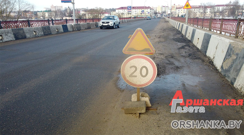 Узнали в Оршанском райисполкоме, когда планируется ремонт моста. Для организации дорожного движения в настоящее время временно проведен ямочный ремонт дорожного полотна. Установлены знаки ограничения скорости до 20 км/ч.