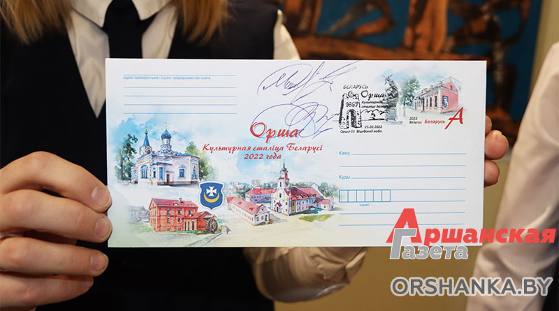 Сегодня в Оршанской художественной галерее В. А. Громыко состоялось специальное памятное гашение художественного маркированного конверта с оригинальной маркой «Орша – культурная столица Беларуси 2022 года».