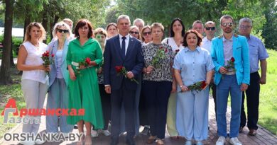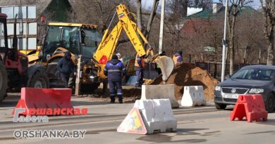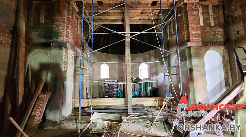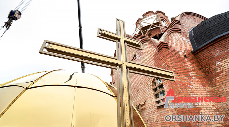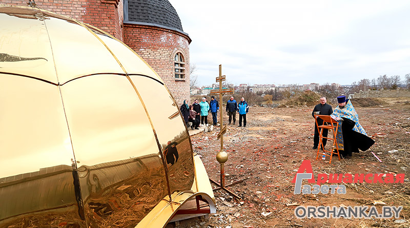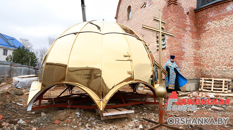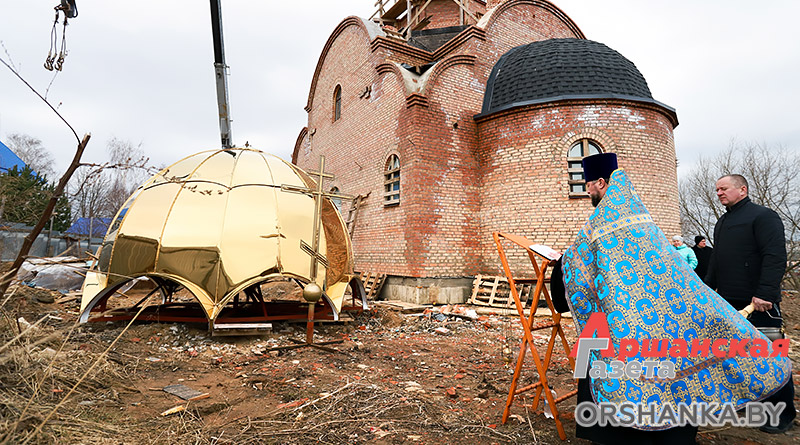 Запланированные работы проводили в непростых погодных условиях при сильных порывах ветра. Перед установкой благочинный церквей Центрального благочиния г. Орши иерей Дмитрий Савушкин совершил чин освящения большого креста и купола.