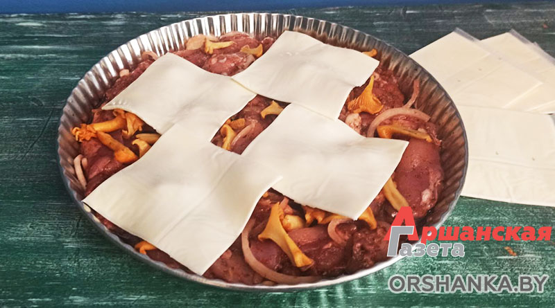 Для приготовления нам понадобится: мясо куриных бедрышек без кости – 400 г, лисички – 150 г, 1 большая луковица, соль и приправа по вкусу, 200 г сметаны, 10 г кукурузного крахмала, зелень (на ваш выбор), 50 г сыра, растительное масло для смазывания формы.