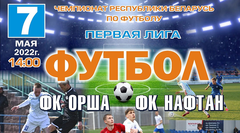 7 мая на городском стадионе по ул. Ленина, 39 пройдет игра 5-го тура чемпионата Беларуси по футболу среди команд первой лиги: ФК «Орша» – ФК «Нафтан» (г. Новополоцк). Начало в 14.00.