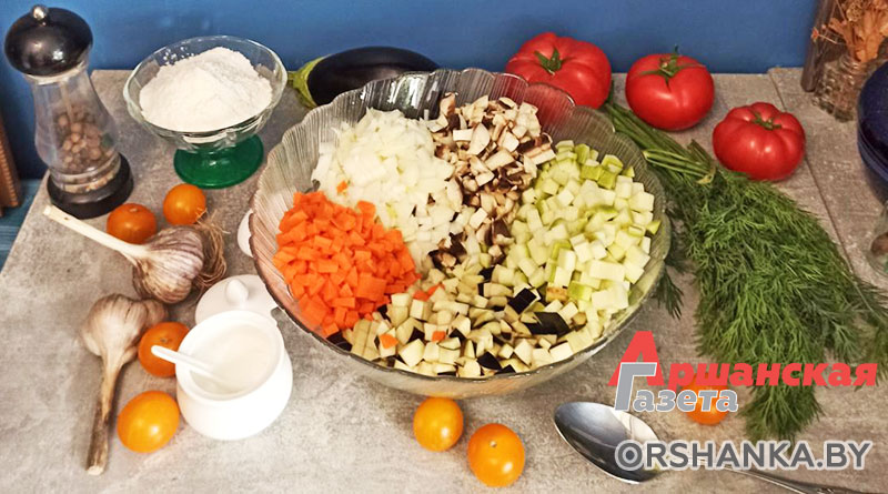 1 баклажан, 1 кабачок, 1 морковь, луковица, 100 г шампиньонов, 4 яйца, 6 ст. л. муки, соль, черный перец, пара зубчиков чеснока, растительное масло для жарки, 200 г воды, 200 г сметаны, ваша любимая зелень.