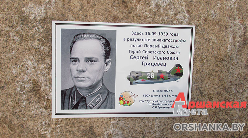 Сергей Грицевец родился в Новогрудском уезде Минской губернии в 1909 году. Окончил Златоуский металлургический техникум, работал слесарем на заводе. Затем служил летчиком в эскадрилье авиационной бригады Киевского авиационного истребительного авиаотряда. Был направлен на учебу в Одесскую школу воздушного боя. Работал летчиком-инструктором. Возглавил рекордный перелет шести истребителей по маршруту Спасск Дальний-Хабаровск. Участвовал в боевых действиях в Испании, Монголии. Совершил 138 боевых вылетов. Во время боя под Халхин-Голом С. Грицевец посадил свой Ил-16 недалеко от командира части, майора В. Забалуева, самолет которого упал из-за поломки двигателя. Грицевец вывез Завалуева с вражеской территории. Также он командовал отдельной группой новейших истребителей И-153 «Чайка». За время воздушных боев на Халхин-Голе сбил 12 самолетов. За подвиги 29 августа 1939 года майору было присвоено звание дважды Героя Советского Союза. Погиб Сергей Иванович в результате летного происшествия 16 сентября 1939 года на аэродроме Болбасово. Его память участники митинга почтили минутой молчания, возложили цветы и венки к подножию памятного знака.