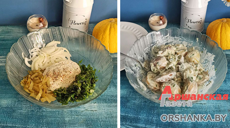 Для соуса: 2 маринованных огурца, 1 луковица, укроп, зеленый лук, 300 г сметаны.