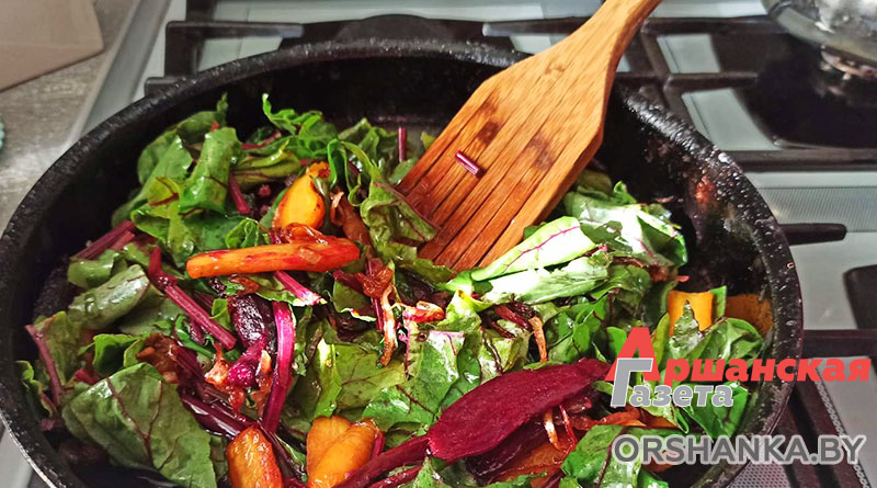 Готовим овощи. Морковь, свеклу, лук нарезаем в произвольной форме. Обжариваем. Соль и приправу добавляем по вкусу. Когда овощи уже готовы, добавляем к ним листья свеклы, тушим буквально 2-3 минуты. Выкладываем на порционное блюдо отварной картофель с соусом и овощами.
