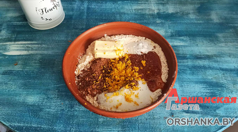 Для приготовления нам потребуется: 220 г муки, 100 г сахара, 110 г сливочного масла, 20 г какао, 80 г черного шоколада, порубленного на кусочки (при желании можно добавить изюм, орехи, клюкву, вишню, любые сухофрукты), 80 г меда, 1 ч. л. разрыхлителя, сухой имбирь, корица, цедра целого апельсина.