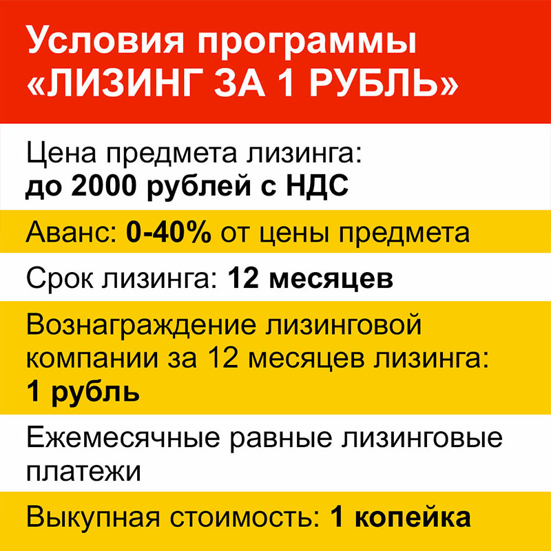 Оформить лизинг можно на срок от 12 до 60 месяцев. Авансовый платеж — от 0% до 40% от стоимости товара.