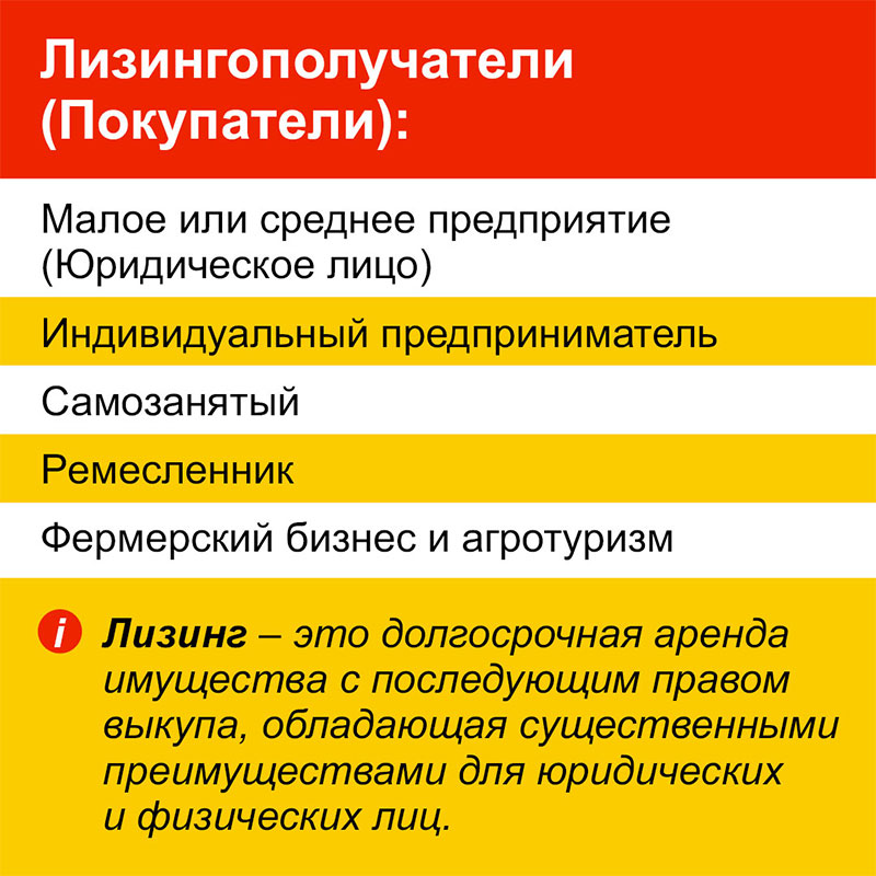 Получить лизинг на новые или б/у товары могут юридические и физические лица, индивидуальные предприниматели, ремесленники и самозанятые. Лизинг позволяет выбрать продавца: дилеры, поставщики, интернет-магазины или частные лица.