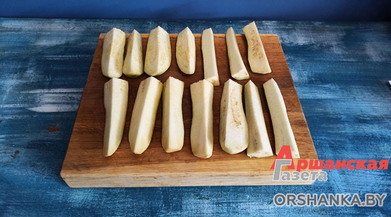 Снимаем с них кожуру, нарезаем на длинные полоски. Готовим на пару минут 10, затем перекладываем на сковороду и обжариваем до готовности.
