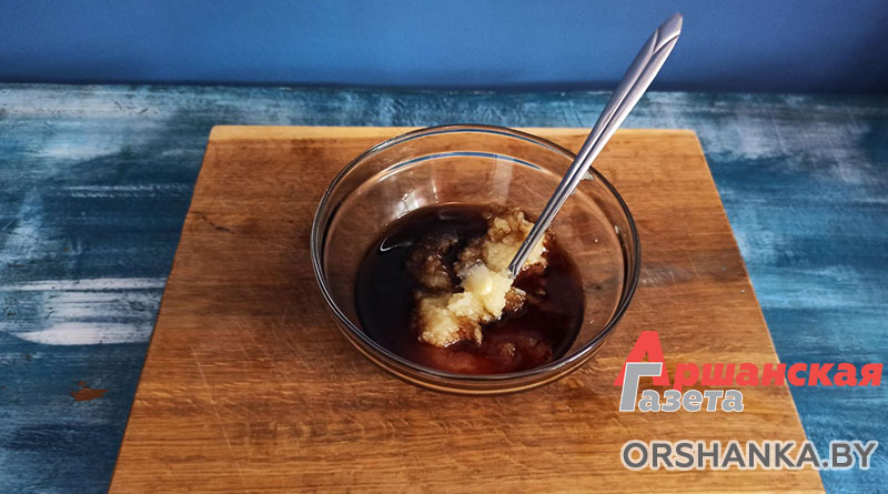 Готовим соус. Берем 1 ст. л. меда, 2 ст. л. устричного соуса, 2 ст. л. соевого соуса, 3 измельченных зубчика чеснока, 1 ст. л. горчицы, соль по вкусу. Все смешиваем и заливаем обжаренные баклажаны. Карамелизуем минут 5, равномерно перемешивая каждый кусочек баклажана в соусе.