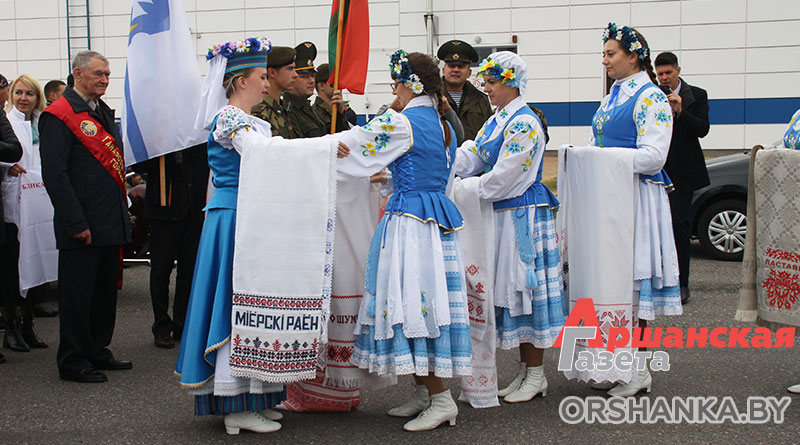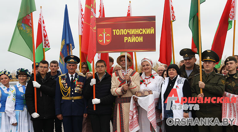 Делегация Толочинского района вручила государственный флаг Республики Беларусь и рушники районов, которые уже приняли участие в проекте, почетному гражданину города Орши Анатолию Кирилловичу Милосердному. Оршанцы в свою очередь вручили соседям каравай из зерна оршанских полей нового урожая.