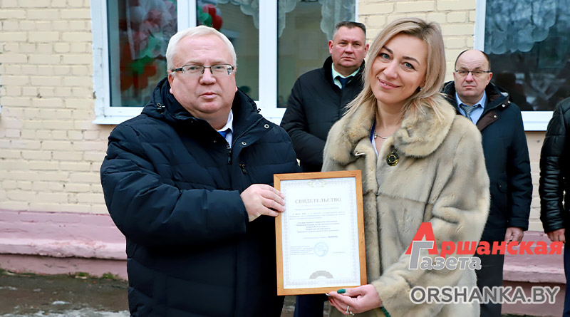 Владимир Терентьев вручил свидетельство о государственной регистрации директору учреждения образования Вилене Довгиловой.