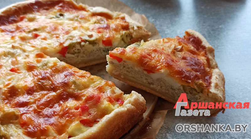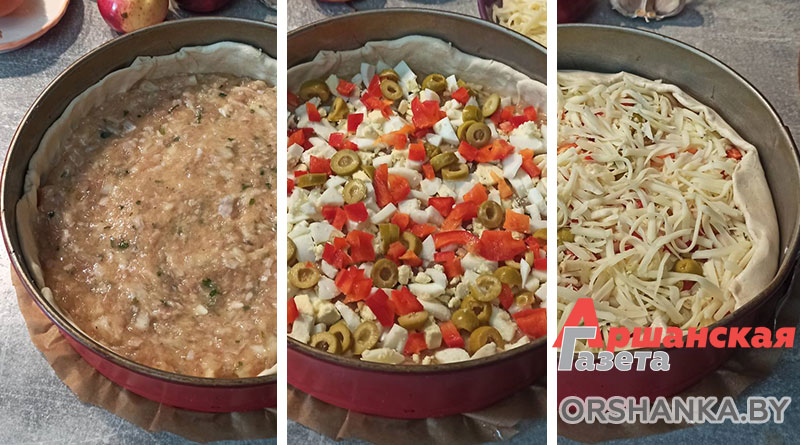Нам понадобится: упаковка готового слоеного теста, куриный фарш – 500 г, сладкий перец, 70 г оливок, 2 сваренных яйца, 120 г сыра, пара зубчиков чеснока, соль и приправа по вкусу.