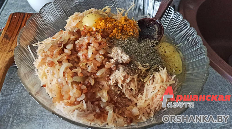 Чистим картофель, трем на мелкой терке. Добавляем 2 яйца, зажарку, куркуму, черный перец, соль по вкусу. На горячую сковороду наливаем растительное масло, ложкой выкладываем драники, обжариваем с двух сторон до золотистой корочки.