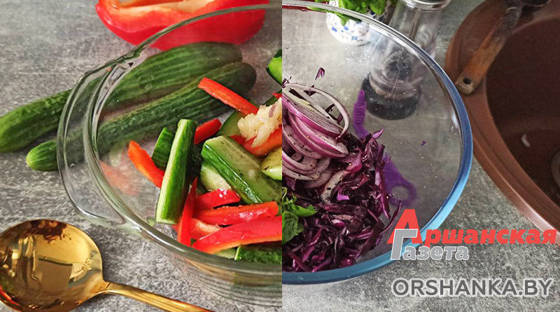Подаем с охлажденной сметаной. Можно подавать с овощными салатами. Я делала салат из красной капусты, красного лука, петрушки, заправленный оливковым маслом, солью. И второй салат – из свежего огурца, красного перца, чеснока, заправленный бальзамическим уксусом, оливковым маслом, черный перец, соль по вкусу.