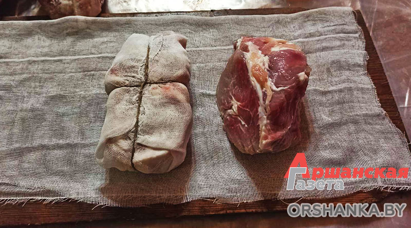 Затем вынимаем все кусочки и кладем на решетку для просушки, чтобы с мяса и сала полностью ушел рассол. Только после этого заворачиваем каждый кусочек в марлю и обвязываем льняной нитью. Раскладываем полуфабрикаты на решетку в коптильную камеру и закрываем крышку. Зажигаем огонь в печке, к которой присоединена печная труба под углом 20-45 градусов. Через нее дым попадает в коптильню, в результате чего продукты приобретают копченый вкус. Огонь поддерживаем на протяжении двух дней.