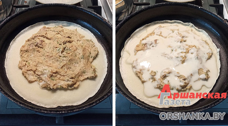 Сверху на фарш наливаем небольшое количество теста. Обжариваем на среднем огне до золотистого цвета. Переворачиваем и жарим с другой стороны. Готовые блинчики кладем друг на друга, при желании каждый блинчик можно смазать небольшим количеством сливочного масла. Для соуса зелень нарезаем и перемешиваем со сметаной, добавляем соль.