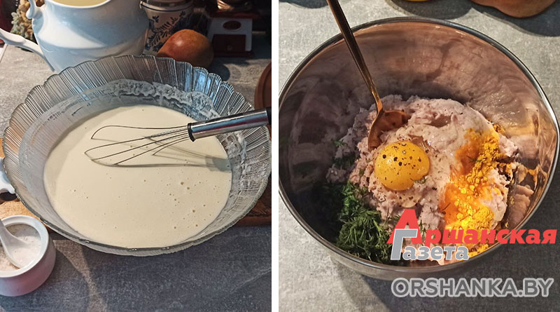 Для фарша (мясного припека): свинина – 300 г, 1 крупная луковица (она придаст сочность фаршу), 1 яйцо, соль, куркума, черный перец, пучок укропа.
