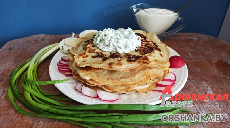 Подаем блины со сметанным соусом с зеленью.