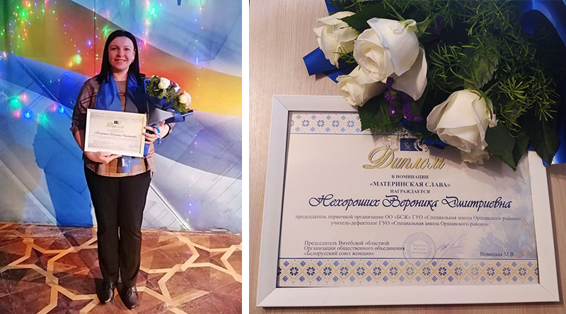 Одним из лауреатов в номинации «Материнская слава» стала Вероника Нехороших, председатель первичной организации ОО «БСЖ» государственного учреждения образования «Специальная школа Оршанского района», учитель-дефектолог государственного учреждения образования «Специальная школа Оршанского района».