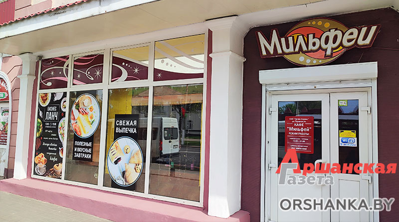 Кафе «Мильфей» находится в центре города по адресу: г. Орша, ул. Мира, д. 5. Время работы: с 12.00 до 21.00 без выходных и перерыва на обед.