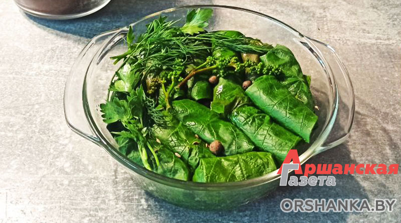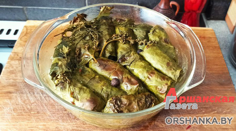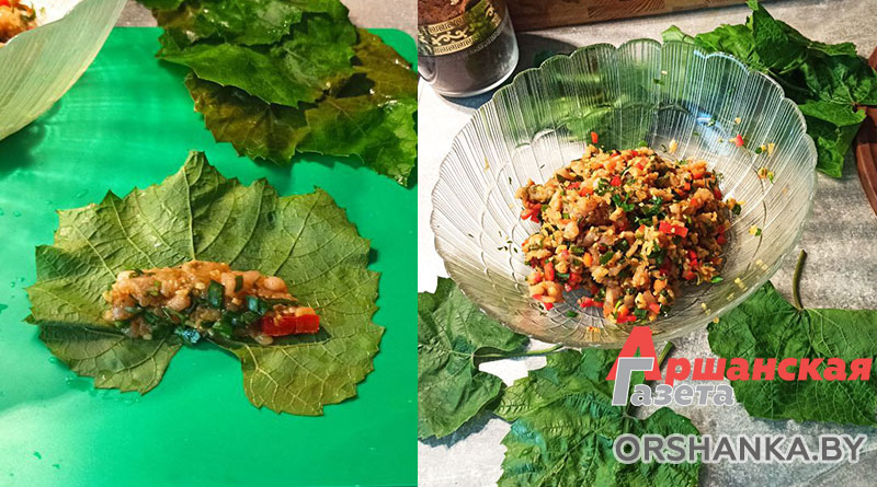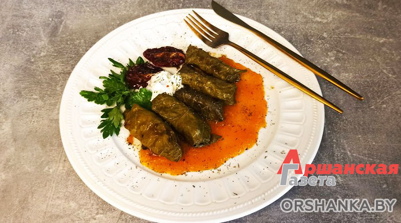 Готовим блюдо долма. Оно напоминает голубцы из листьев капусты, но мы будем использовать виноградные листья, начиненные фаршем, булгуром, с добавлением овощей. Подаем с соусом на ваш вкус – йогурт, майонез или сметана.