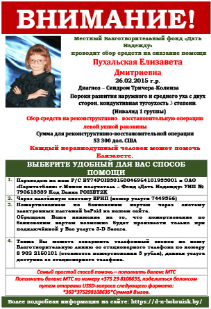 Местный благотворительный фонд «Дать Надежду» просит Вас оказать нам помощь в сборе средств на реконструктивно-восстановительную операцию левой ушной раковины Пухальской Елизавете 26.02.2015 года рождения, инвалид 1 группы.