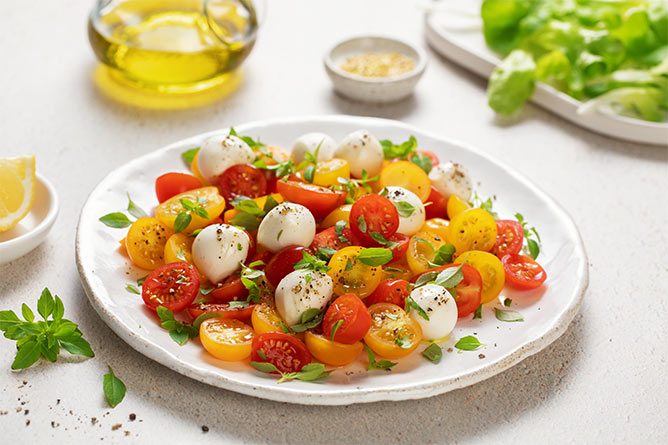 ОАО «Савушкин продукт» предлагает вам также приготовить оригинальные салаты с использованием сыров торговой марки SVEŽA: салат с адыгейским сыром на гриле и летний салат из черри и моцареллы.