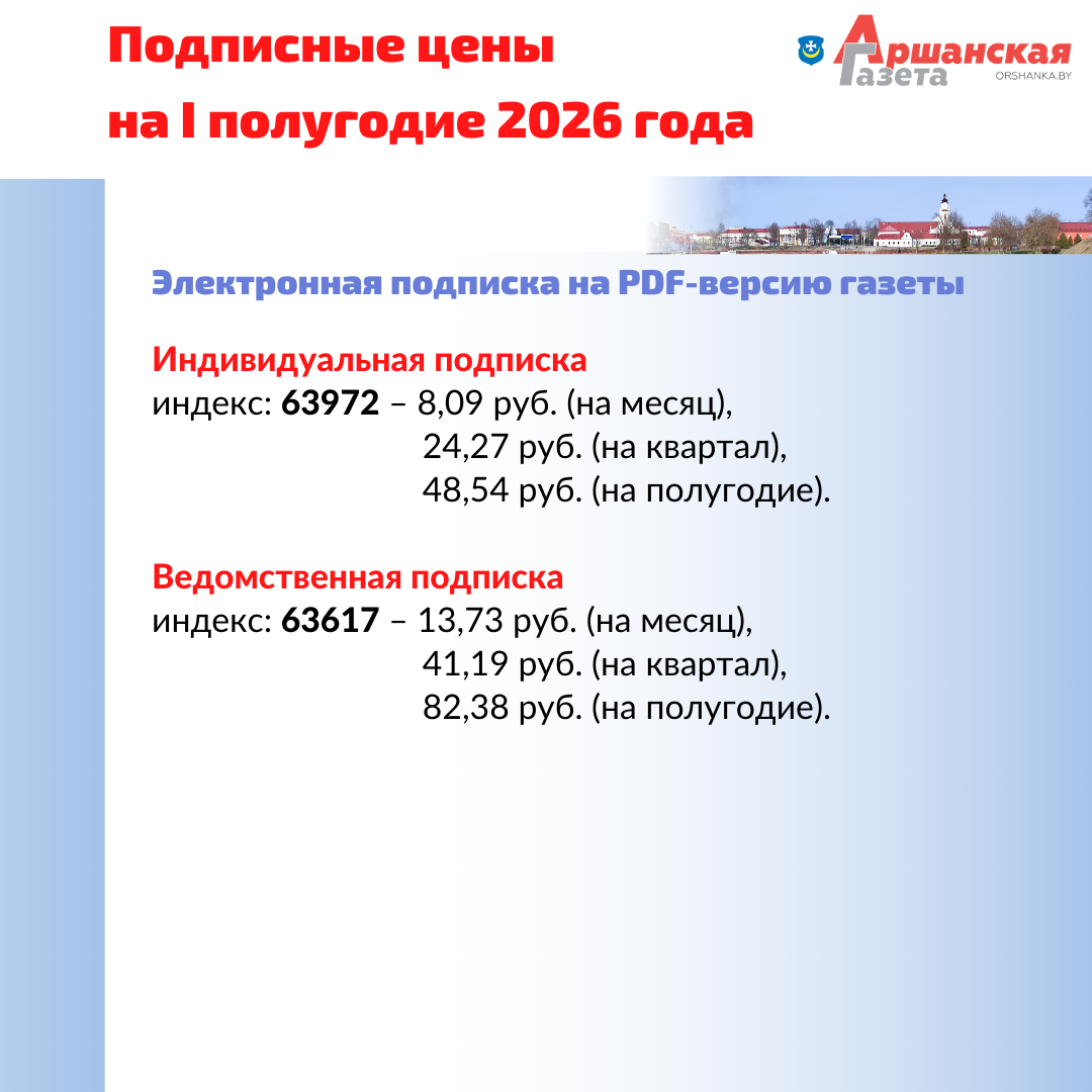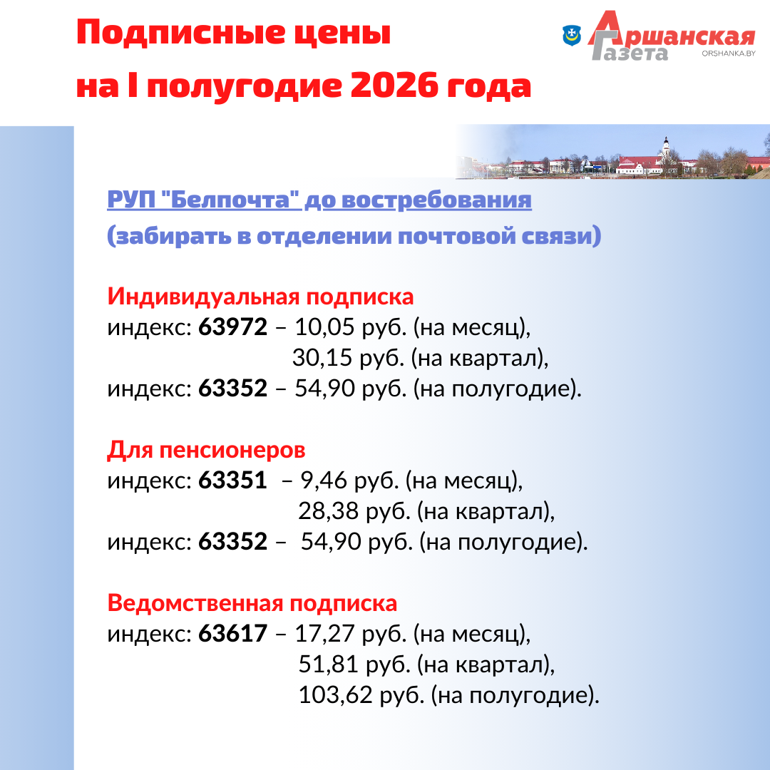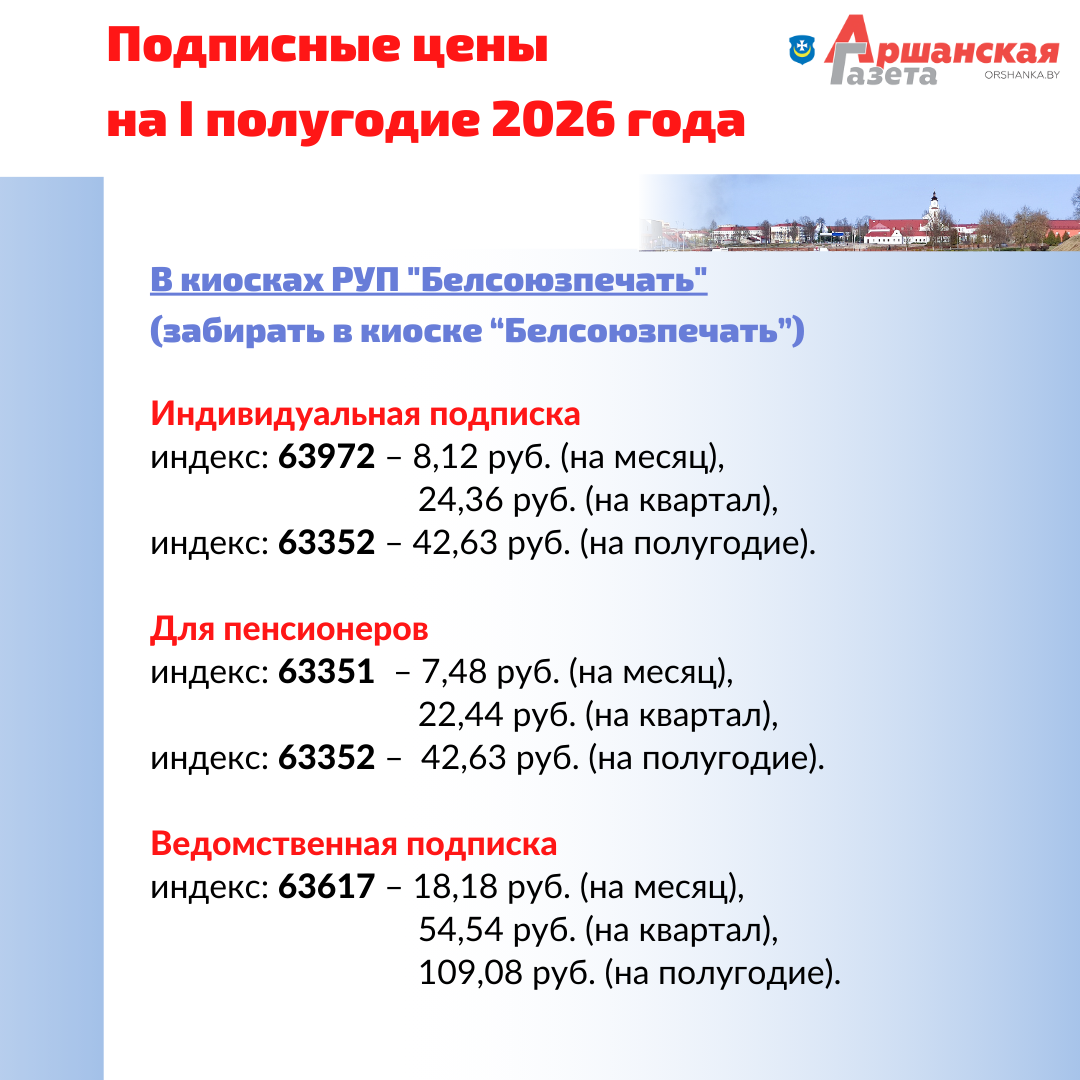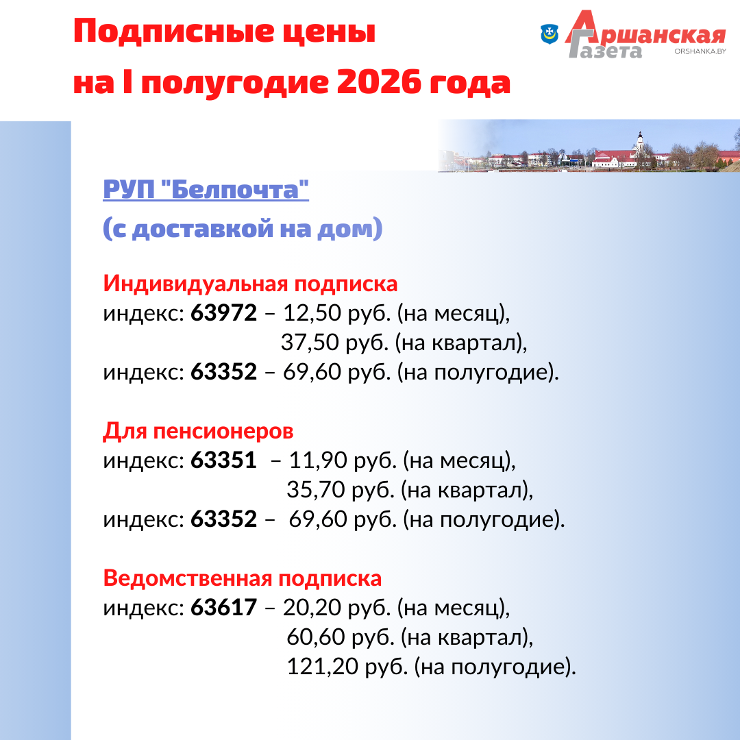 Подписаться на «Аршанку» можно во всех отделениях связи Орши и района, у почтальонов, общественных распространителей и в киосках РУП «Белсоюзпечать». Напоминаем, сейчас газета выходит два раза в неделю. Телепрограмма (31 канал), частные объявления публикуется в номере за среду.